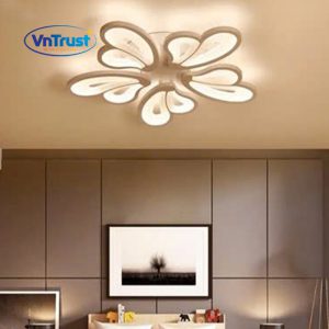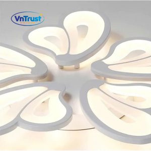 ✨ Năm cánh LED mềm mại xếp vòng, tỏa hào quang trắng – trung tính – vàng – pha trộn, vẽ nên “đầm sen ánh sáng” trên trần.